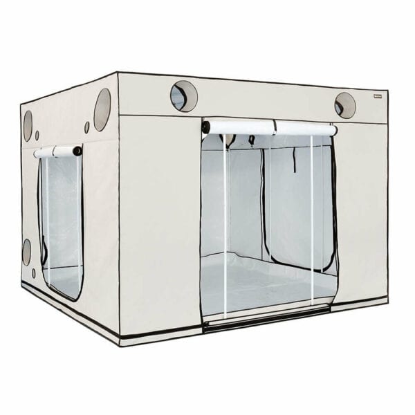 Die HOMEbox Ambient Q300+ stellt mit ihren 300x300x220cm die größte verfügbaren Growbox dar. Diese riesige Anbaufläche von 9 m² bietet genug Platz für jede Art der Kultivierung, ideal für erfahrene Grower. Durch zwei große Fenster und eine große Vordertür ist die Box gut begehbar und leicht zugänglich. Vier 1000W Natriumdampflampen oder entsprechend leistungsfähige LED Grow Lampen sorgen für eine gleichmäßige Ausleuchtung. Wie gewohnt, besticht die HOMEbox durch hochwertige und langlebige Materialien, ergänzt durch eine PAR+ Innenbeschichtung, die viel Licht und wenig Hitze reflektiert. Die belastbare Rahmenstruktur kann ein Gewicht von bis zu 200 kg tragen – ideal für schwere Ausstattung. Es werden 2 Jahre Herstellergarantie gewährt, was die Zuverlässigkeit des Produkts unterstreicht. Dreh- und Schwenkventilatoren wie z.B. Taifun FlatFan Ventilatoren sorgen für die optimale Luftzirkulation in der Box.
