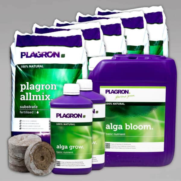 Für die Blütephase ist der Plagron Alga Bloom enthalten, ein Dünger, der die Blütenbildung stimuliert und den Geschmack der geernteten Früchte und Blüten verbessert. Alga Bloom sorgt für eine natürliche und intensive Blütenausbildung und verbessert die Qualität der Ernte durch die Bereitstellung essenzieller Nährstoffe.